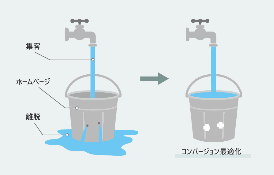 まずやるべきことは、水を注ぐこと(集客)ではなく、バケツの穴を塞ぐこと(ホームページのCVR改善)なのです。