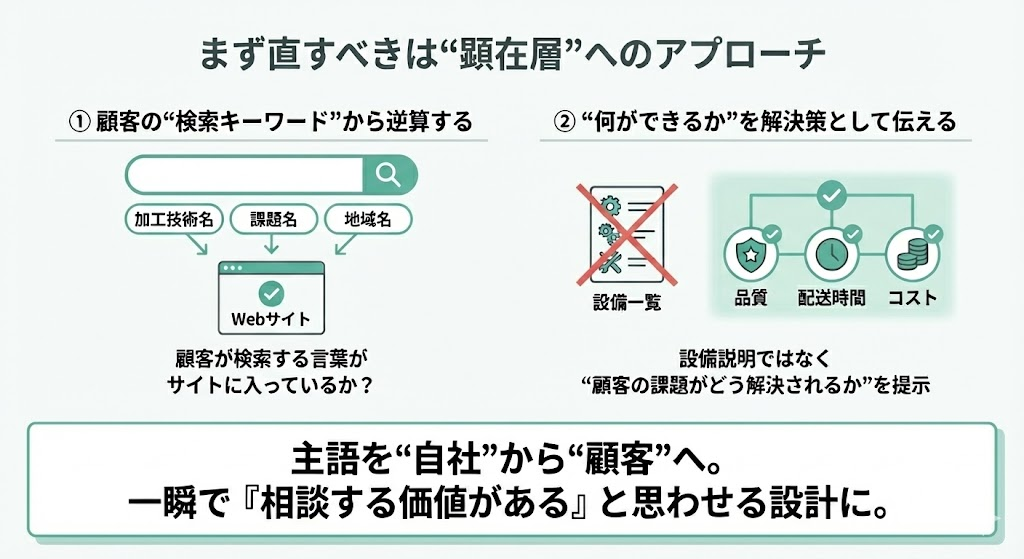 多くの企業が、自社の業種名(例:「板金加工」)などの「ビッグキーワード」だけで検索対策をしがちです。しかし、これでは競合が多く、具体的なニーズを持つ「顕在層」には届きにくいのが現実です。