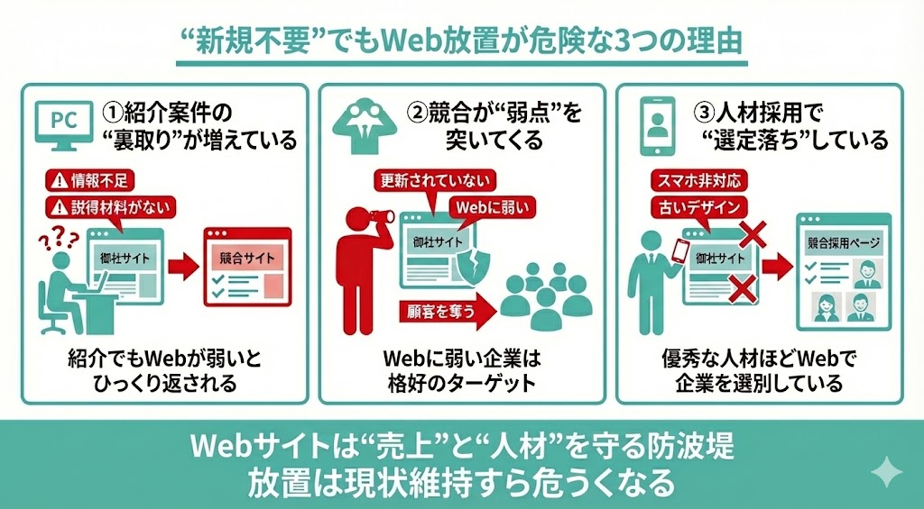 「今の売上を維持したい」──その願いすら、Webサイト放置によって叶わなくなる可能性があります。
